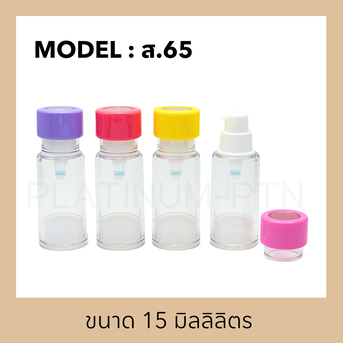 – ขวดอะคริลิครุ่น ส.65 ขนาด 15 มิลลิลิตร ราคา 24 บาท (สีใสฝาคละสี)
